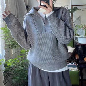 外贸跨境女装亚马逊针织衫翻领拉链毛衣女秋冬宽松慵懒风外穿套衫