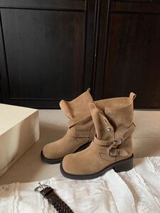 葡萄妈studiolee增高5.5cm~ 秋日美拉德翻折两穿扣带牛反绒中筒靴