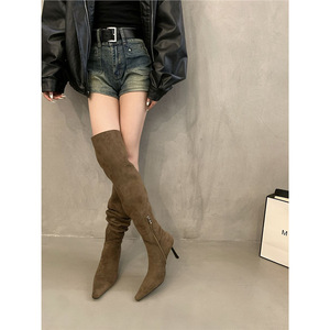 尖头高跟过膝长靴女2025新款秋季法式卡其色细跟褶皱堆堆靴骑士靴