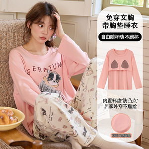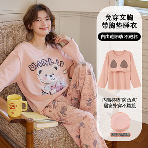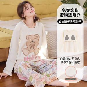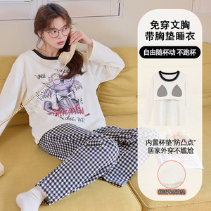 睡衣女秋长袖卡通可爱棉质家居服带胸垫套装少女初中生春秋季韩版