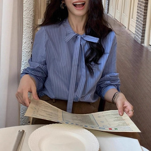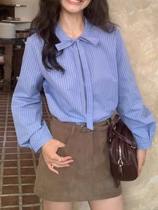 pusumede 转角街头 蓝色蝴蝶结绑带条纹衬衫女长袖衬衣气质上衣