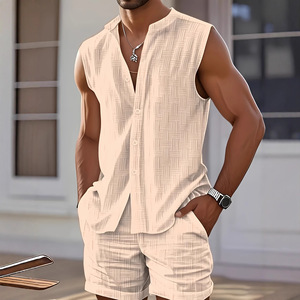 跨境欧美夏季新款时尚男士提花休闲立领无袖开衫短裤运动男士套装