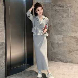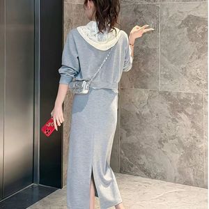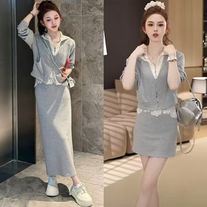 休闲套装女春秋小个子洋气蕾丝拼接连帽卫衣高腰半身裙两件套