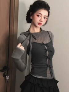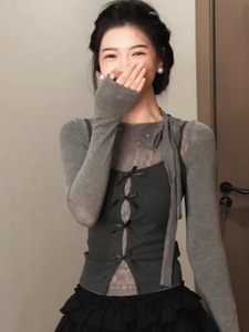 灰色辣妹蝴蝶结真两件长袖t恤女秋季设计感纯欲风修身打底衫上衣