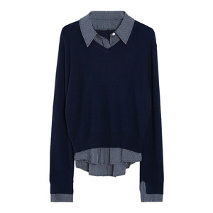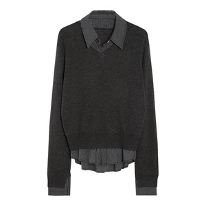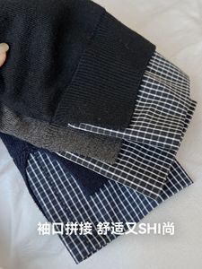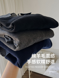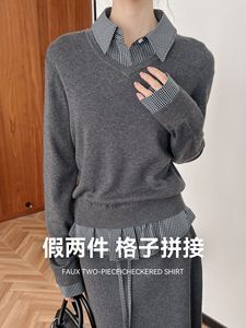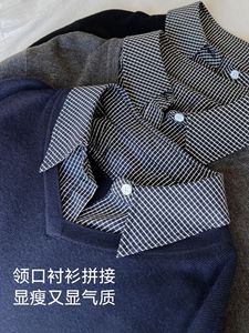 韩系假两件格子拼接毛织上衣秋冬新款羊毛翻领长袖打底外穿POLO衫