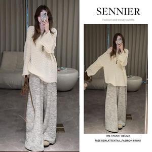 韩系慵懒小香风斜纹编织立体银丝秋款高级感阔腿裤