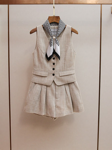 深圳南油高端女装秋季新款气质通勤风飘带马甲A字阔腿短裤套装女