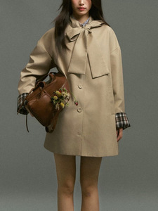 SunsetPar日落公园 "秋日序曲"卡其格纹拼接复古蝴蝶结风衣外套棉