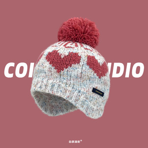 2025新款韩国费尔岛风爱心毛球护耳毛线帽子女秋冬保暖百搭针织帽