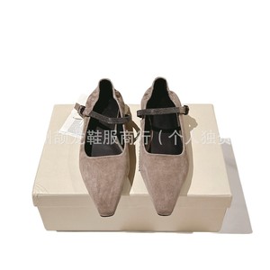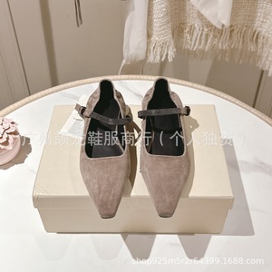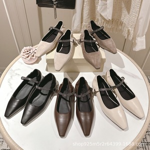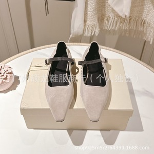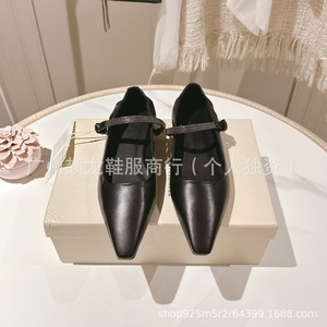 高端2025新款真皮尖头浅口串珠链一字扣带平底时装单鞋小皮鞋女