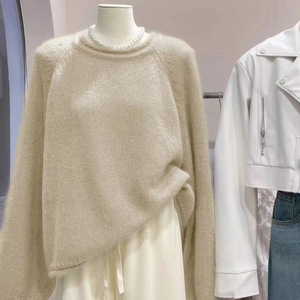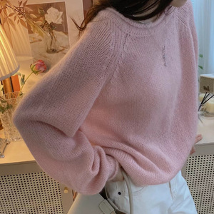 欧货高端100%纯羊毛衫女宽松慵懒秋冬粉色软糯针织圆领打底毛衣