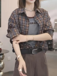 时尚复古高级感格子衬衫女士早秋2025新款气质百搭Polo领长袖衬衣