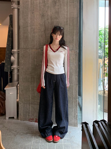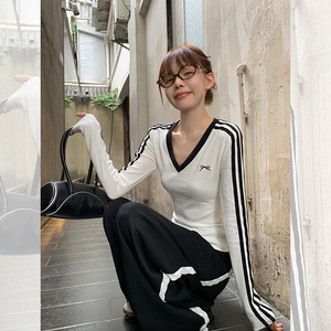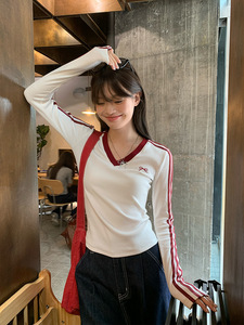 宋正恩蝴蝶结绣花拼色长袖t恤女秋季新款v领修身显瘦内搭上衣