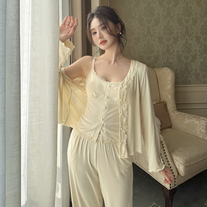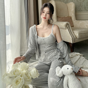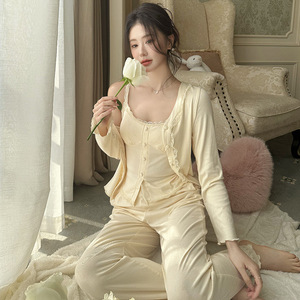 睡衣女胸垫春秋款针织棉甜美高级感外穿长裤睡衣三件套家居服