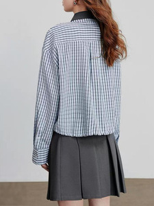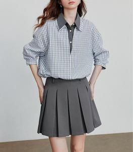 2025秋新款拼接双重领假两件肌理感格纹女士衬衫百褶短裙两件套