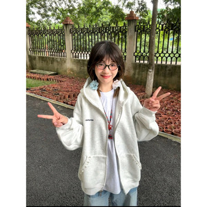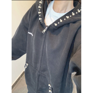 美式复古珍珠钉珠连帽卫衣女外套春秋薄款情侣装潮牌高街学生上衣