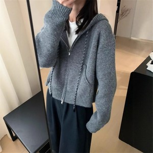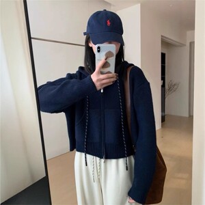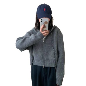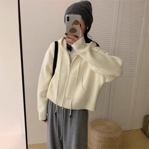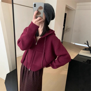 休闲短款抽绳连帽拉链毛衣外套女宽松秋冬加厚小个子针织开衫上衣