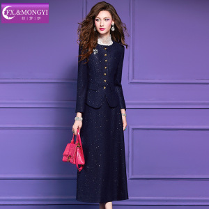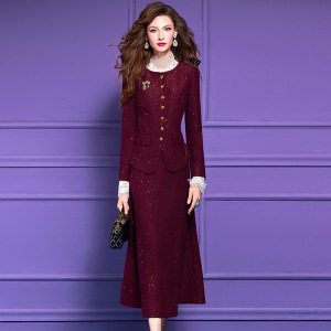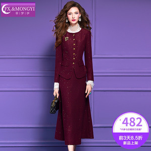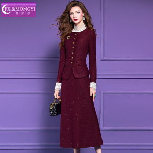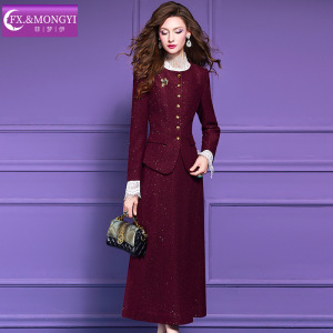 菲梦伊含羊毛亮片红色毛呢套装女秋冬新款复古名媛小香风外套半裙
