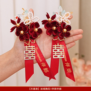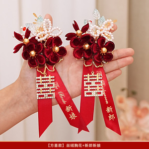丝绒方喜_结婚胸花1对【新郎新娘】中式飘带