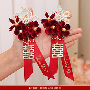 丝绒方喜_结婚胸花1对【父亲母亲】飘带