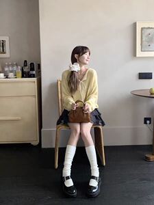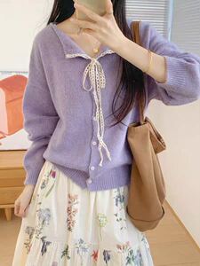 颂恩韩系气质软糯针织开衫单排扣百搭花边绑带毛衣女2025新款外套