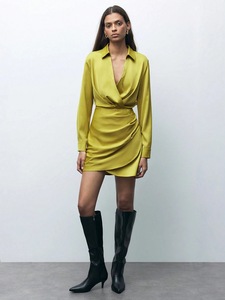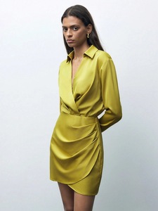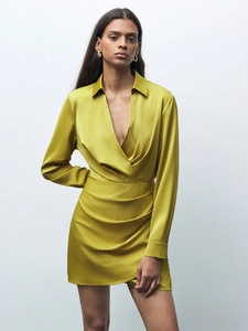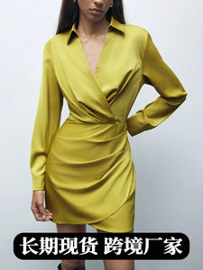 亚马逊跨境欧美独立站女装 秋季新款缎面连衣裙 褶皱百搭色丁裙子