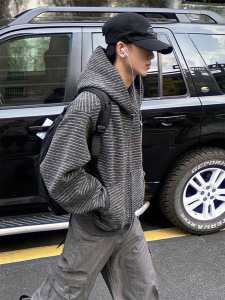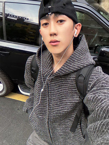 黑白条纹连帽开衫卫衣男款秋季潮牌设计感小香风美式街头拉链外套