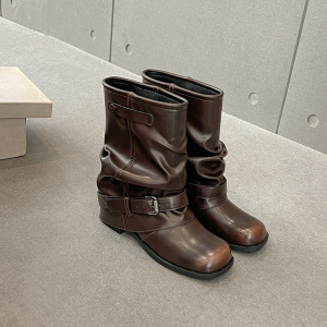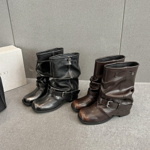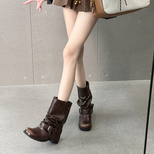 牛皮版~复古裤管短靴女粗跟2025秋冬新款褶皱堆堆西部牛仔骑士靴
