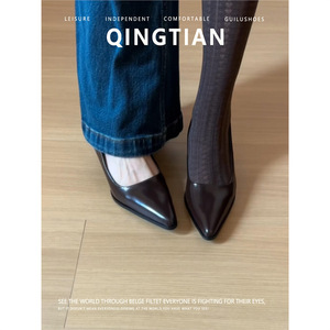 羊皮版~真皮尖头浅口单鞋女粗跟不累脚通勤一脚蹬软皮中古高跟鞋