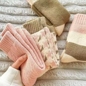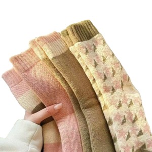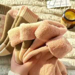 秋冬款加绒厚袜子女中筒袜潮款毛圈花纹纯色长袜冬天加厚保暖高筒