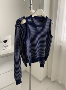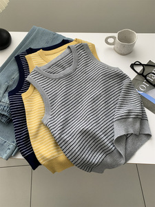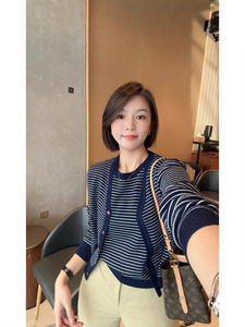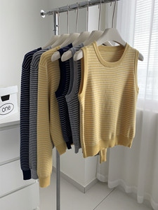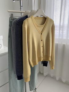 韩版简约显瘦V领条纹针织开衫背心两件套女秋冬款小个子毛衣外套