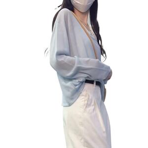 早秋蓝色多巴胺韩风chic盐系上衣防晒薄款罩衫时尚休闲拼接假两件