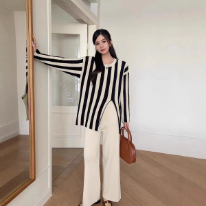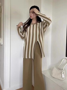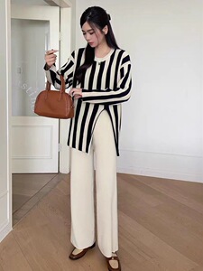 跨境欧美设计感竖条纹圆领开叉针织衫上衣高腰阔腿长裤时尚两件套