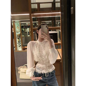 titi小姐姐日光柔纱长袖衬衫女秋法式宫廷风立领收腰雪纺上衣
