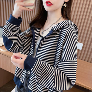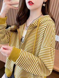 早秋小个子短款外套女春秋韩版宽松小众设计感百搭连帽条纹卫衣潮