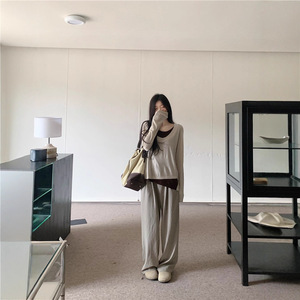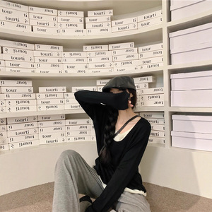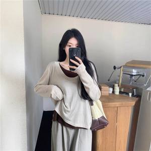 大码撞色拼接假两件针织衫上衣女早秋新款慵懒风设计感毛衣