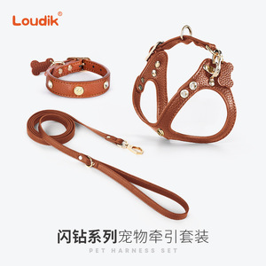 Loudik厂家批发奢华皮革狗狗胸背带宠物牵引绳狗项圈中小型犬跨境
