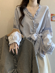 法式边V领长袖衬衫女早秋2025新款高级感大码胖mm收腰遮肚上衣