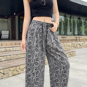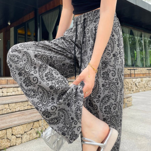 复古印花缎面冰丝裤子女夏季薄款腰果花窄版宽松阔腿裤遛弯防晒裤