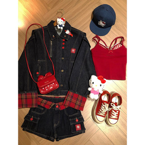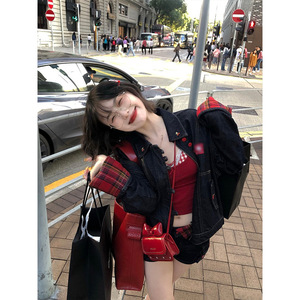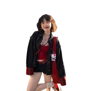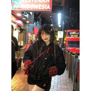 刺绣标格子拼接牛仔外套女2025秋季新款复古甜酷风宽松夹克开衫