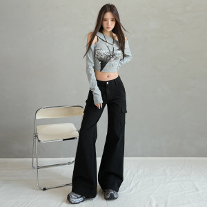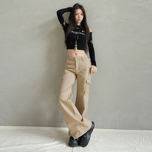 卡其色大口袋工装牛仔裤女2025新款秋冬季宽松拖地休闲弹力喇叭裤