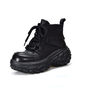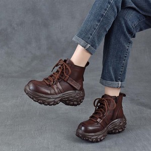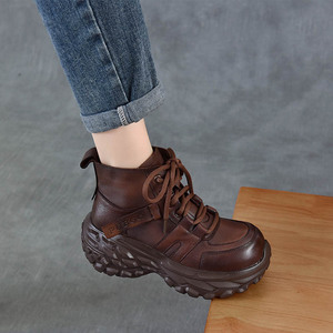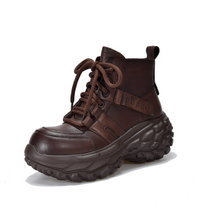 以一秋冬新款高帮老爹鞋短靴头层牛皮复古软底女靴松糕厚底休闲靴