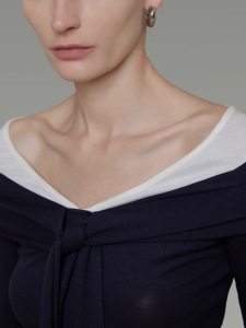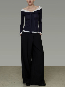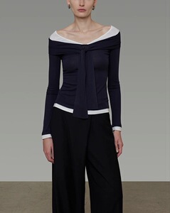 UNSPOKE 假两件一字肩针织衫女2025秋季新款设计感撞色系带上衣