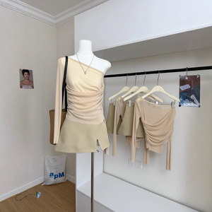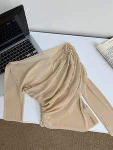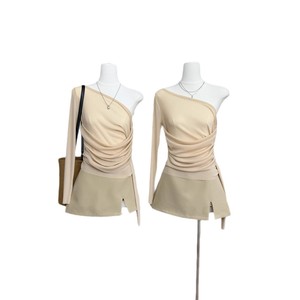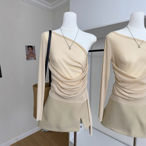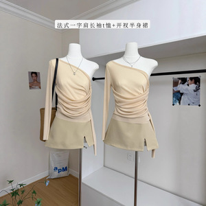 2025秋季新款法式一字肩长袖t恤女秋季修身收腰显瘦上衣两件套