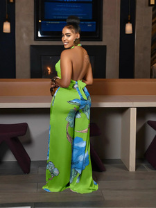 现货2025跨境欧美气质通勤挂脖露背印花无袖白色上衣阔腿裤2件套