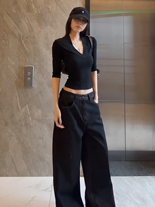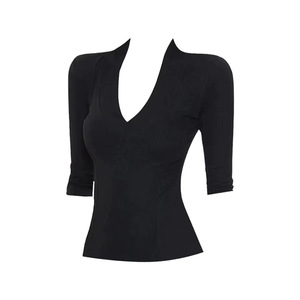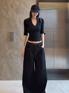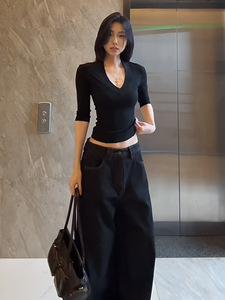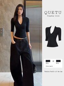 辣妹风正肩V领黑色T恤女装夏季新款独特别致修身显瘦中袖短款上衣