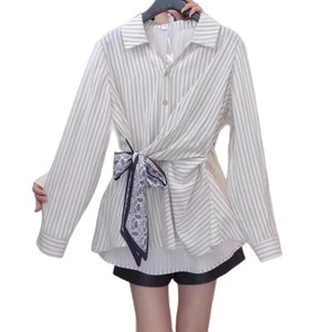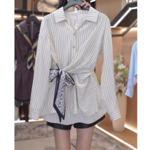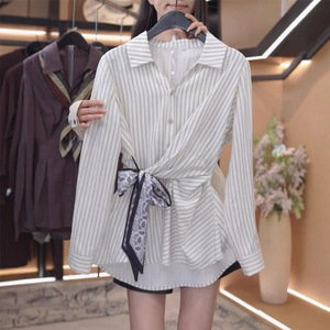 韩版绑带收腰条纹衬衫女2025秋季新款时尚设计感小众显瘦长袖上衣