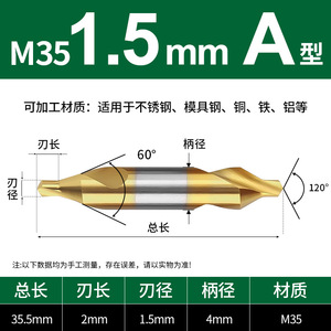 60度A型中心钻头定心钻镀钛含钴双头不锈钢专用定位1/2/3/4/5/6/8