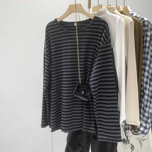 2025慵懒风chic春秋冬季打底衫美式条纹t恤女宽松中长款长袖上衣