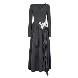 气质复古2025秋装新款长袖不规则蝴蝶长裙早秋穿搭弹力掐腰连衣裙